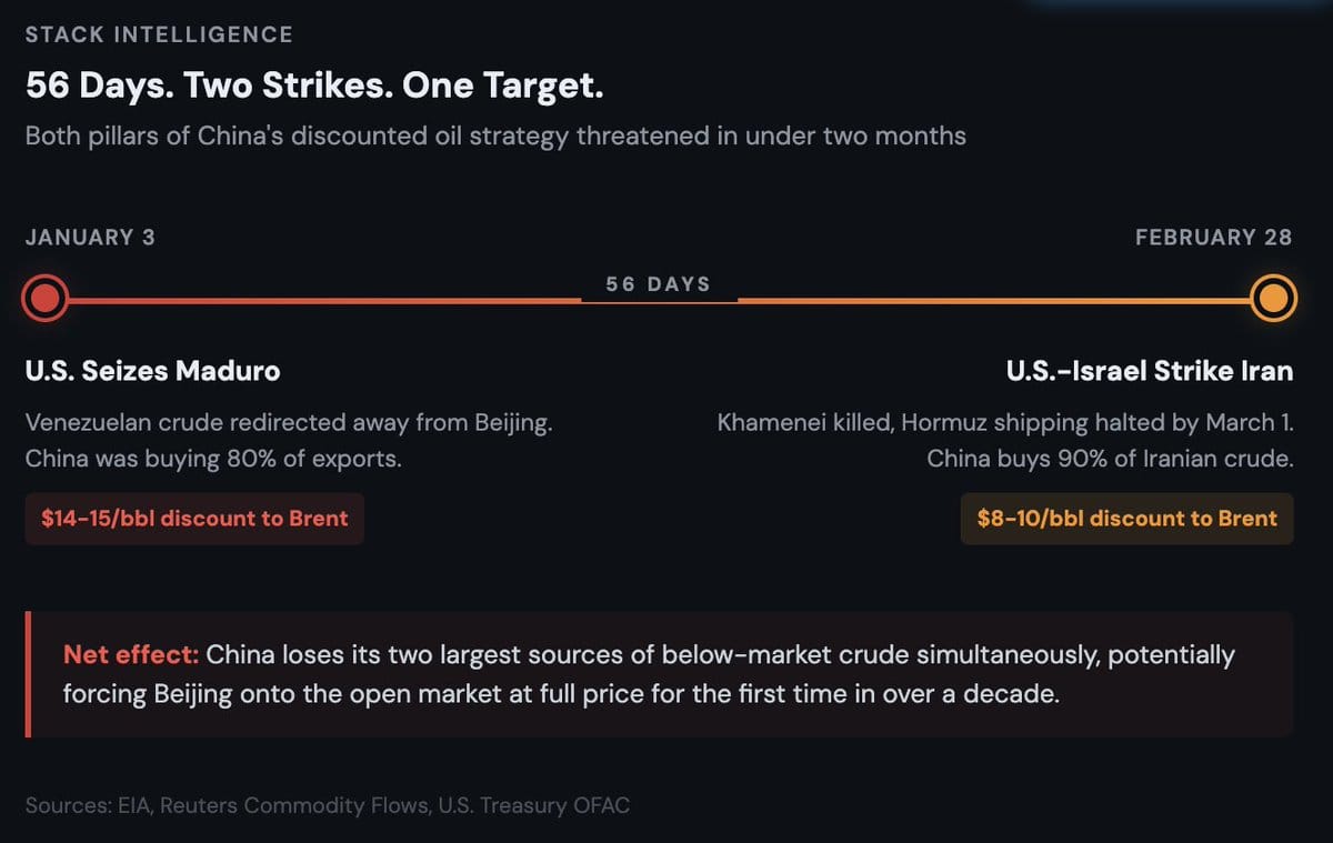 Now connect this to what the U.S. did in January. They seized Maduro and started redirecting Venezuelan crude away from Beijing, which had been buying 80% of those exports at $14-15 per barrel below Brent. Eight weeks later they are bombing Iran, where China buys 90% of crude at $8-10 below Brent. The two largest sources of China's discounted oil, gone or under direct military threat within 56 days of each other. You do not need a conspiracy theory to see a pattern when the pattern is sitting right there.